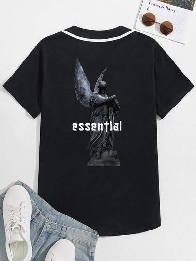 Manfinity 男士字母人物圖案拼接邊襯衫 - 黑色 - 查看 1