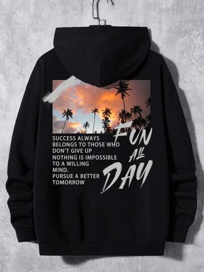 GENTILAND 超大号男士标语和热带印花落肩抽绳连帽衫 - 黑色 - 查看 1