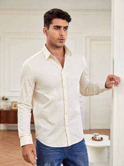 Manfinity NiteLyfe 休閒鈕扣純色男士襯衫 - 米色 - 查看 1