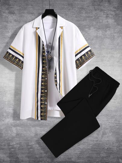 Manfinity RSRT 男士條紋印花襯衫和腰部抽繩長褲不帶T恤