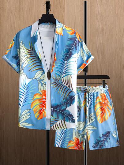 Manfinity RSRT 男士熱帶圖案襯衫和腰部抽繩短褲不帶T恤