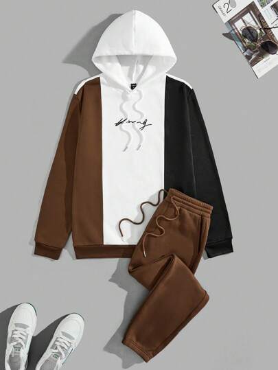 Manfinity RebelGame 男士拼色字母印花抽繩連帽衫和運動褲休閒 2 件/套