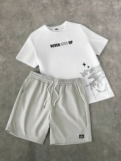 Manfinity Unisex 男士休闲标语印花T恤和纯色抽绳短裤两件套夏季情侣装 - 灰色 - 查看 1