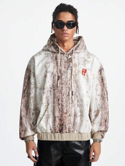 Manfinity VCAY 男士宽松数码印花连帽针织运动衫,秋冬款 - 卡其色 - 查看 1