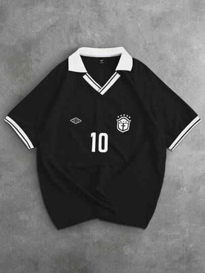 Manfinity Campus Court 男式纯色拼布短袖数字印花 Polo 衫 - 黑色 - 查看 1