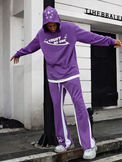 PAVTROS 2 件男士字母印花连帽运动衫和前系带短裤套装 - 紫色 - 查看 1