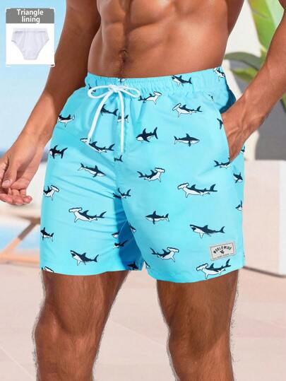Surfspeed 男士前系带全印花休闲沙滩短裤,简约度假风格,夏威夷风 - 藍色 - 查看 1