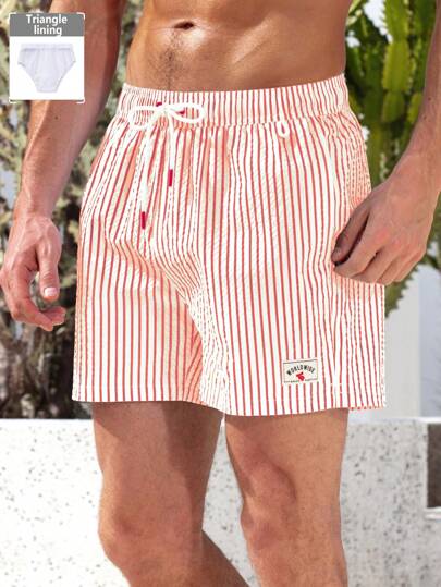 Manfinity Swimmode 男士条纹印花贴花抽绳腰袋休闲短裤 - 橘色 - 查看 1