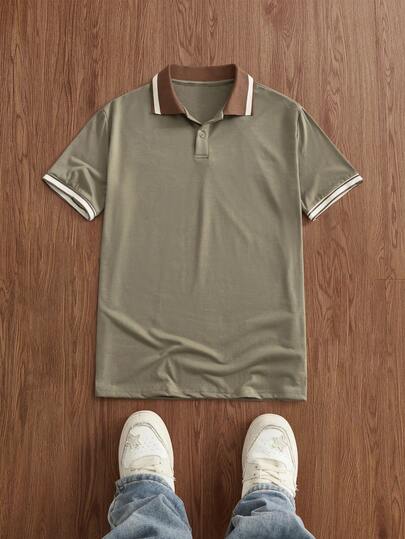 Manfinity Unisex 男士休闲通勤条纹短袖针织Polo衫,夏季 - 橄欖綠 - 查看 6