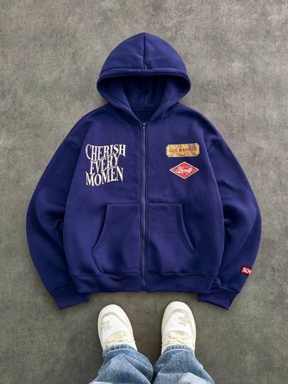 Manfinity Unisex 男士休闲拉链连帽衫,带丝网印花,宽松版型,春秋季,秋冬 - 寶藍色 - 查看 1