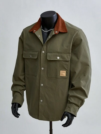Manfinity VCAY 1件男士休闲宽松拼接长袖衬衫,秋季款 - 橄欖綠 - 查看 5
