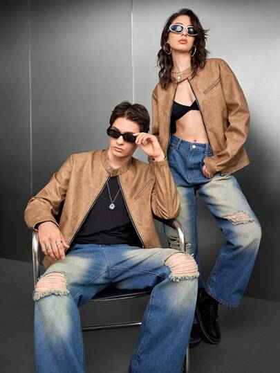 Manfinity VCAY 1 件男士宽松梭织休闲 PU 皮夹克,适合秋冬 - 鏽棕色 - 查看 1