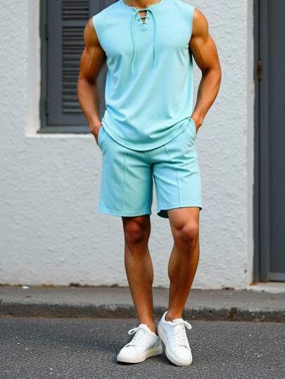 Manfinity VCAY 男士针织修身圆领休闲上衣套装(2件套),适合夏季穿着 - 綠色 - 查看 4