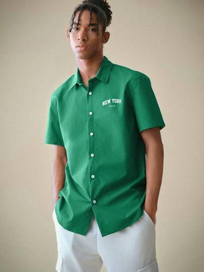 Manfinity VCAY 宽松男士字母印花休闲衬衫 - 綠色 - 查看 1