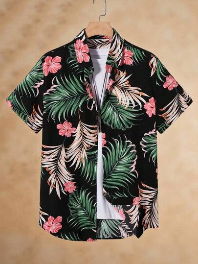 Manfinity BRENVOR 男士热带印花衬衫(不含T恤),适合夏季度假和情侣穿着 - 黑色 - 查看 1