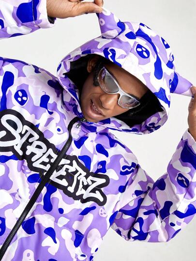 Manfinity VCAY 男士数码印花长袖连帽棉服外套,适合秋冬 - 紫色 - 查看 6