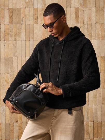 Manfinity VCAY 男士针织休闲羊毛连帽衫,带刺绣字母,适合秋冬 - 黑色 - 查看 1