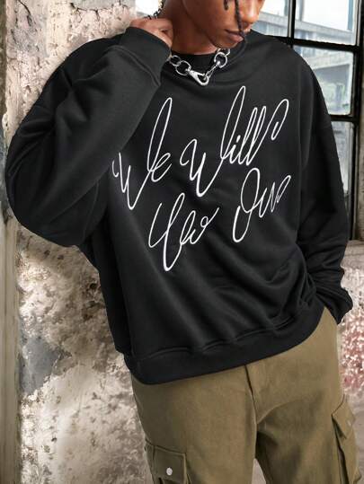 Manfinity VCAY 男士宽松印花圆领长袖套头衫,秋冬装 - 黑色 - 查看 1