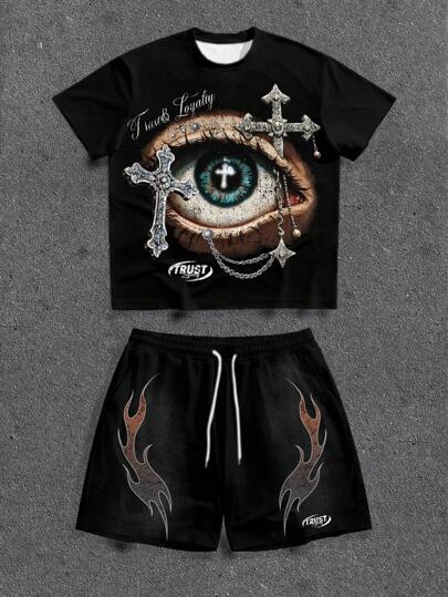 Manfinity ZONE917 男士哥特式十字架与火焰印花破洞 T 恤套装 - 黑色 - 查看 1