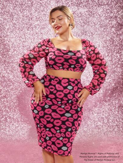 Marilyn Monroe X SHEIN 大尺碼全印花方領短上衣和裙子套裝,春夏風格 - 彩色 - 查看 1