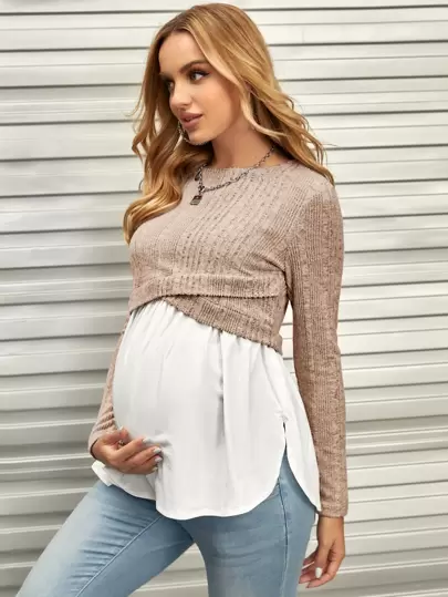 SHEIN 孕妇交叉裹身 2 合 1 长袖哺乳 T 恤 - 杏色 - 查看 1