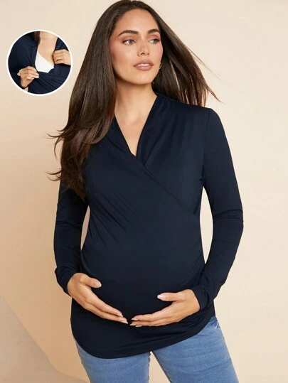 MaterniWear 孕妇纯色长袖简约交叉哺乳上衣 - 藏蓝色 - 查看 1