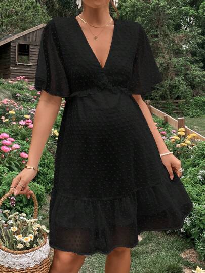 SHEIN 孕婦圓點蝴蝶袖荷葉邊連衣裙 - 黑色 - 查看 1