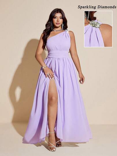 Maweii 大码优雅褶皱钻石装饰不对称领口高开衩连衣裙