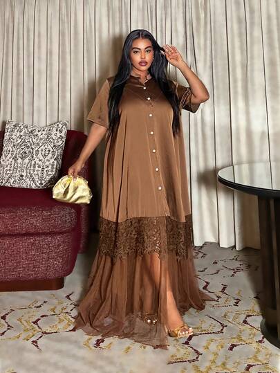Maweii 大码女士休闲度假日常开衫,带纽扣、荷叶边下摆和网纱拼接,宽松舒适的A字连衣裙