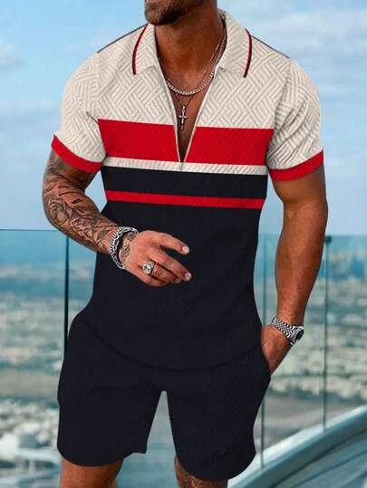 男士全印花 Polo 领短袖上衣和口袋短裤两件套休闲西装、度假装、春季休闲装、老款男士、父亲节礼物、父亲节服装 - 黑色 - 查看 1