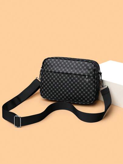 男士休闲格子单肩包,新款韩版真皮斜挎包,时尚小方包,品牌拼接小背包,公文包,单肩包 - 藏蓝色 - 查看 1