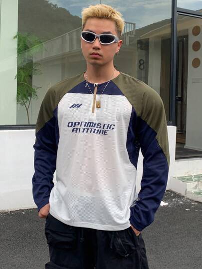 DAZY 男士拼色字母印花长袖 T 恤,秋季,图案 T 恤 - 彩色 - 查看 1