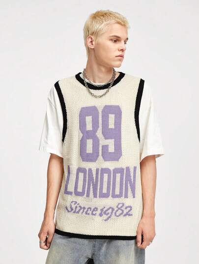 ROMWE MEN Prep 男士撞色字母和数字印花毛衣背心,春秋 - 杏色 - 查看 1