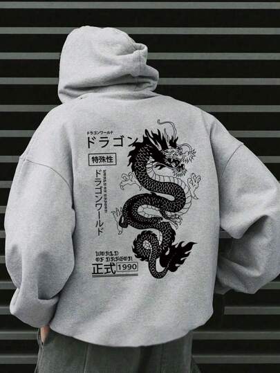 Manfinity Dauomo 男士龍紋和日文字印花下垂肩連帽衫 - 灰色 - 查看 1