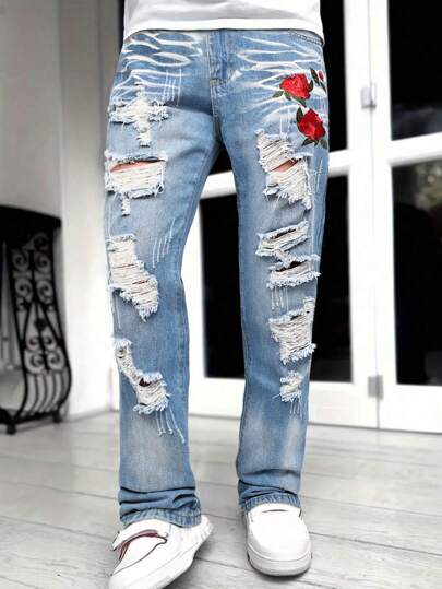 男士时尚休闲户外活动百搭玫瑰刺绣洗水浅色牛仔裤 - 藍色 - 查看 1