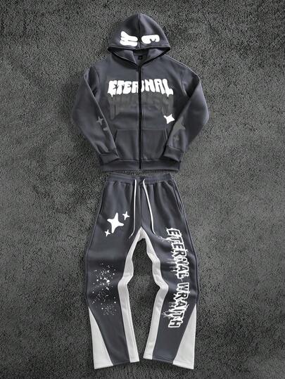 PAVTROS Manfinity Streetrush 男士字母印花保暖连帽衫和运动裤两件套,男士图案运动服,秋冬服装 - 灰色 - 查看 1