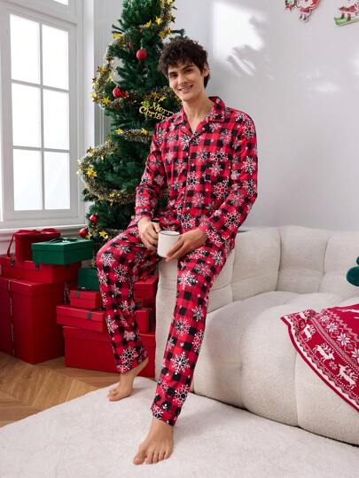 男士格子印花纽扣式长袖上衣和裤子睡衣套装 - 黑色 - 查看 1