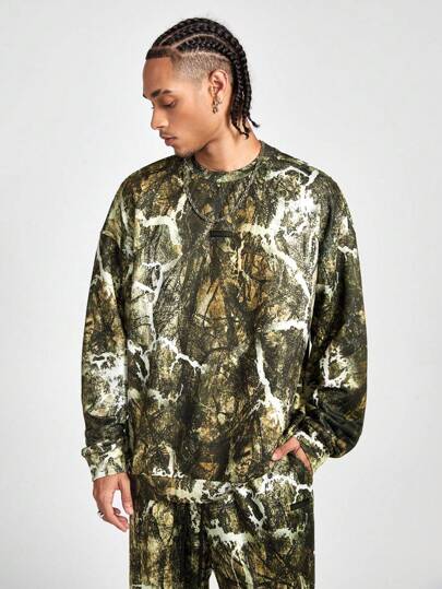 Manfinity VCAY 男士随机印花圆领长袖运动衫和裤子套装,适合秋冬 - 彩色 - 查看 5