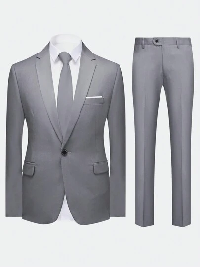 CLOUDSTYLE 男士春秋純色駝鈕西裝領長袖上衣和褲子套裝,適合日常商務和旅行 - 淺灰色 - 查看 1