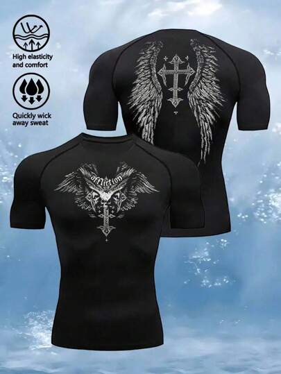 Manfinity Sport Corelite 男式翼印花插肩短袖 T 恤,休闲健身运动服健身服跑步 T 恤和背心修身衬衫圆领 - 黑色 - 查看 1