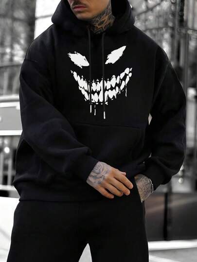 男士印花连帽衫,抽绳设计,休闲春秋季卫衣,适合户外穿着,长袖上衣 - 黑色 - 查看 1