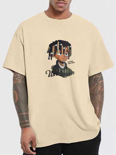 男士人物和字母圖案T恤 - 杏色 - 查看 1