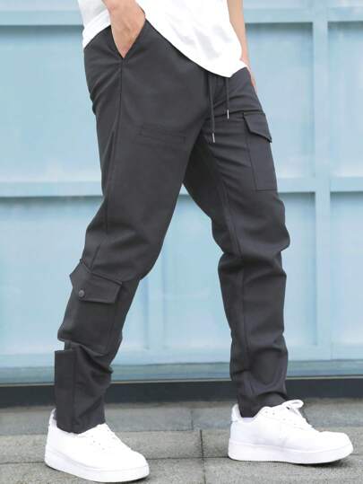 Manfinity Homme 男士寬鬆戶外貨褲,蓋袋式口袋和鬆緊束腰 - 黑色 - 查看 1
