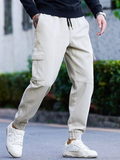 Manfinity 男士側翻蓋口袋腰部抽繩工裝牛仔褲 - 淺灰色 - 查看 1