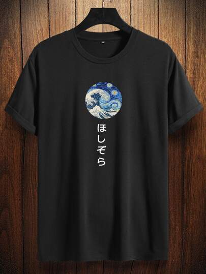 Manfinity 男士日文圖案和波浪印花T恤 - 黑色 - 查看 1