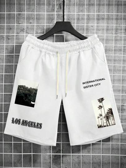 Manfinity EMRG 男士照片和字母圖案腰部抽繩短褲 - 白色 - 查看 1