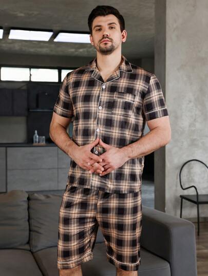 男士格紋印花襯衫和短褲睡衣套裝 - 彩色 - 查看 1