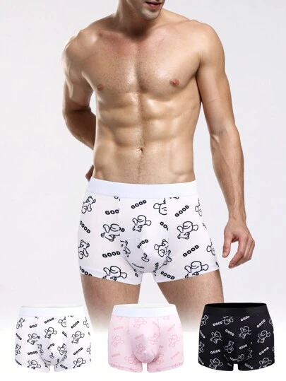 男士卡通熊印花平角內褲(3 件組) - 彩色 - 查看 7