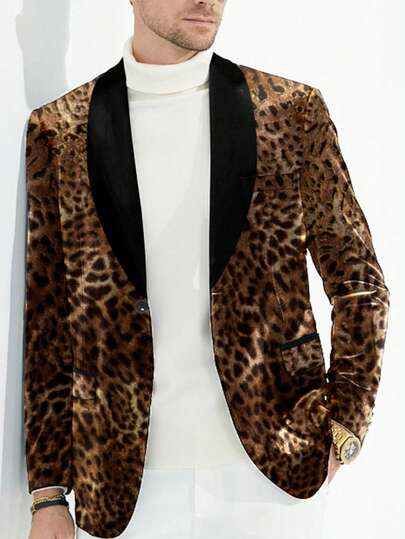 男士豹紋青果領西裝外套 - 棕色 - 查看 1