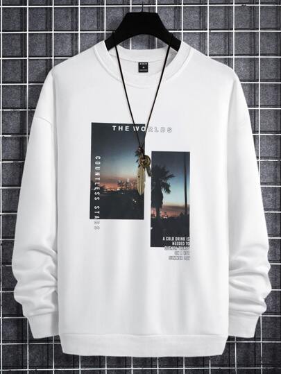 Manfinity Homme 男士標語和照片印花落肩袖套頭衫無項鏈 - 白色 - 查看 1